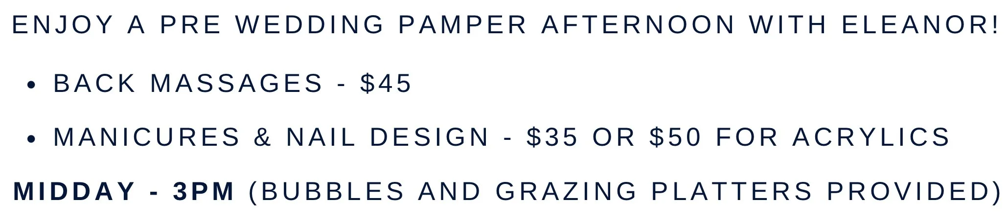 Name * First Name Last Name Phone * (###) ### #### RSVP to Eleanor’s pre wedding event at midday on Saturday 21 December Back massage Manicure and nail design Manicure, acrylics and nail design Would love to join but don’t require pampering No, sorry I can’t make it Dietary requirements * Thank you!
